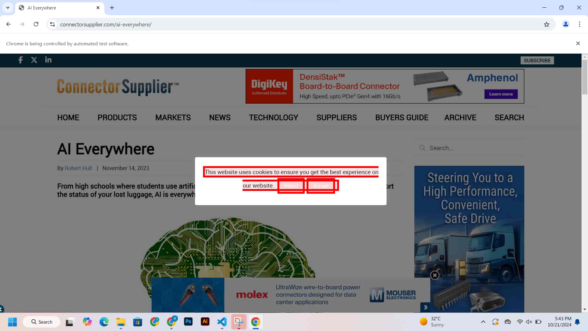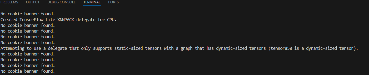 After getting just the screenshots does not really says or do anything, which I then tried prompting ChatGPT to tweak the code such that it can run real-time and detect cookie banner prompts on whichever website I surfed. Upon detection, it would then create this bounding box around the cookie prompts. I was then advice to use Chromedriver as the platform for web testing, which took me awhile figuring how to get it installed. The code first met with some problem trying to detect the cookie banners, however after feeding the error message back to ChatGPT, it managed to resolve it quickly.