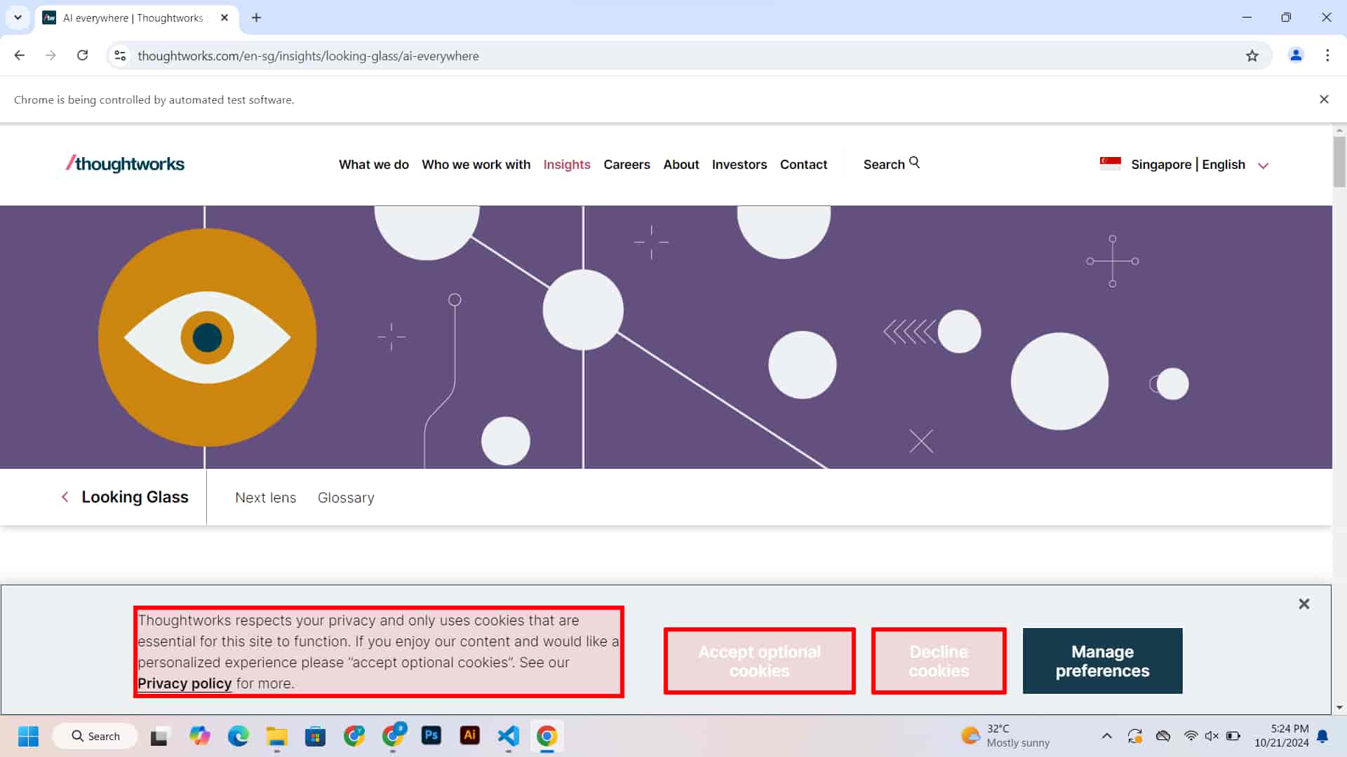 With the cookie finding exercise, I decided to bring it further with the help of ChatGPT on the coding portion. I prompted it to help me come up with a template using OpenCV, Python and Selenium to scrape any cookie prompts and automatically screenshot it. The browser used for it work was with the help of chromedriver which allow users to do testings.