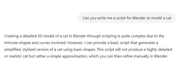 Thereafter, I wanted to test how complex perhaps ChatGPT would be able to script something organic to model and prompted it for cat model. Which resulted in a really simplified version comprising of basic shapes. If the prompts are too complex, it will only execute the simplified versions.