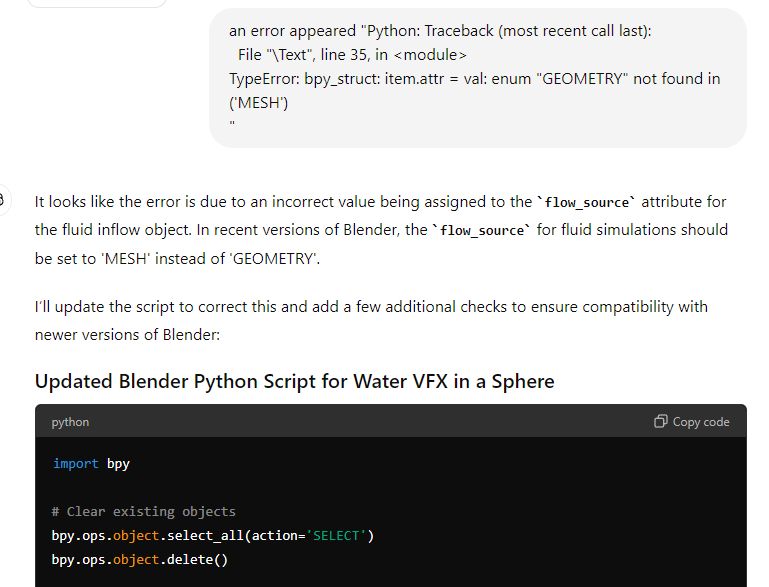 As I was researching out some ways to generate 3D with AI, I chanced upon the opportunity to use python coding in blender and with the help of ChatGPT. For how I tested with the prompt to ask ChatGPT code me a script in blender to create a water vfx in a sphere. As from the videos that I came across was just people testing the 3D model generation part. However, I wanted to take it a level higher to add particle effects. The initial results were not as great as it kept appearing errors in the script provided, thus I tried bringing back the errors to ChatGPT to fix the issues.