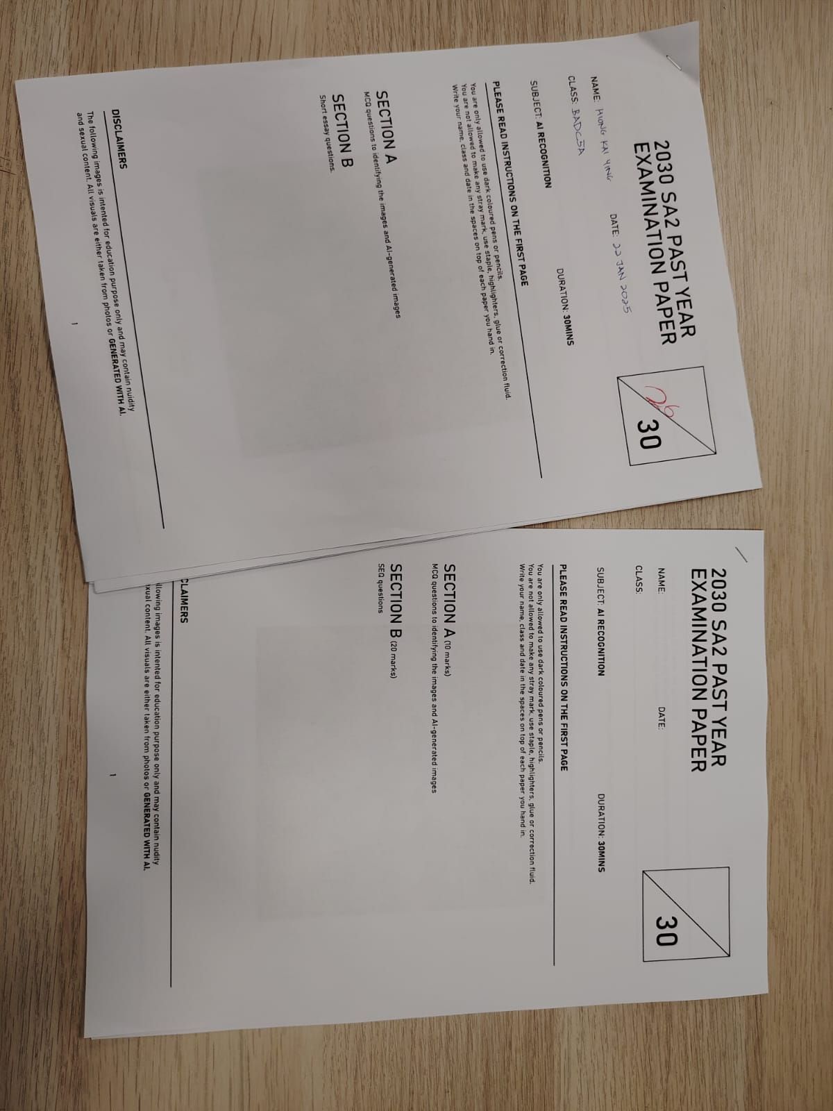 The AI-Identification Exam Paper 2030 is a speculative exam paper that tests the ability of a human to distinguish between real and generated images. Using the same image generation method that was used for the previous publication, I came up with clearer instructions to how the test will be conducted. The treatment to the exam paper was the same as the papers that were set for the typical Primary & Secondary school setting.
